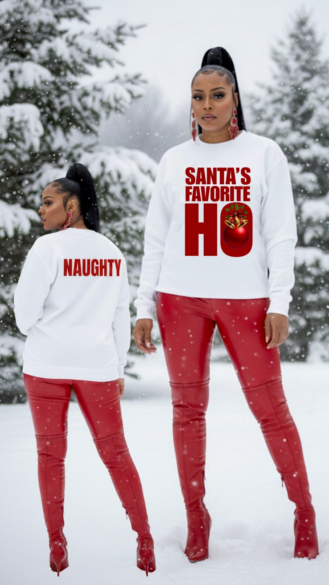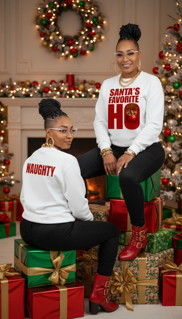 Color Shown: WHITE Crewneck sweatshirt with sarcastic holiday graphic. Back has smaller NAUGHTY message. Available with bell or candy cane accent.